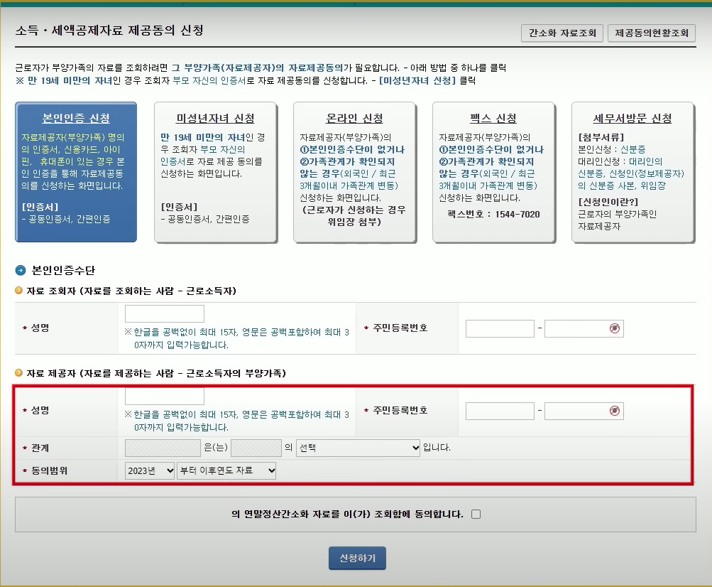 2. 연말정산 부양가족 자료 제공 동의 신청 버튼을 클릭하세요.